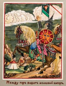 Nicolas Artamonov. Illustration pour le Coq d’or d’Alexandre Pouchkine : « Il voit une tente de soie parmi les montagnes ». Gouache sur papier (24 x 19 cm), dans un cadre vitré. Signé en bas à droite. Николай Артамонов....