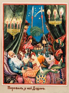 Nicolas Artamonov. Illustration pour le Coq d’or d’Alexandre Pouchkine : « Dodone fait un festin chez elle ». Gouache sur papier (27 x 24,5 cm), dans un cadre vitré. Monogrammé et daté en bas à droite. Николай Артамонов....