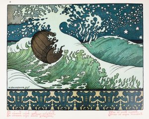 Шедевр билибинской графики, демонстрирует его умение соединить русское национальне творчество и одно из своих увлечений- японскую ксилографию. Влияние японской гравюры на творчество Билибина здесь очевидно. Сравнение волны Хокусая с волной Билибина напрашивается само собой. Билибин являлся знатоком и коллекционером японской гравюры. В его уникальной коллекции были представлены великие имена Утамаро, Хокусаи, Хиросиге.