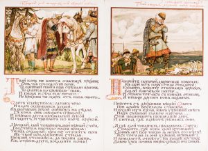 Alexandre Sergueiévitch Pouchkine. Chant d’Oleg le Sage. Saint Pétersbourg, Expédition des papiers d’Etat, 1899. Une grande feuille pliée en acordéon de six pages. Illustrations de Victor Vasnetsov. Ouvrage réalisé par commande de la...