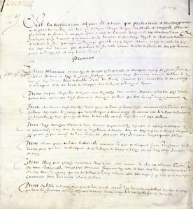 Aveu rendu par Jacques du MASLE et sa femme Ollive de PENBULSO, seigneurs de Carvallo et d’Esruhel pour les nombreux biens qu’ils tiennent de la seigneurie royale de Guérande ; biens localisés à Mesquer, Treucy, Goueslin, etc. Idem listées et quantifiées, les nombreuses rentes dues par : la veuve de Simon Pourcin, Jean Le Baron, Vincent Guymar, Lucas Josseau, Jean Bertho, Jacques Apuril, Etienne Davy, Pizez le Calvez, Perrine Guilloré, les héritiers de Collas Tastevin, Guillaume Trusson, Yvonne Lallemant, etc. L’addition de 1608 concerne d’autres biens… ; Deux cahiers de bi-feuillets de 4 pp., scellés de 2 sceaux plaqués sur papier, de 35,5 x 31,5 cm. On y joint qui complète : ARRÊT de la Chambre des Comptes de Nantes -Acte dressé le 8 février 1601 : Arrêt stipulant l’envoi au Sénéchal de la juridiction de Guérande de l’aveu et dénombrement dressé pour Jacques du Masle, sieur de Carvallo et Ollive de Penbulso sa femme, pour les biens qu’ils tiennent du Roi. Acte sur parchemin avec sceau plaqué sur papier de 31 x 36,5 cm.