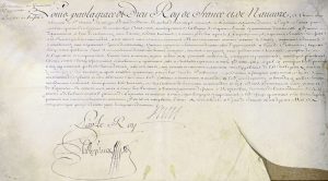 Acte sur parchemin, 307 x 560 mm., fait à Versailles le 10 janvier 1695, signé ‘Louis’ et contre signé ‘Par le Roy / Philypeaux’. Beau document.