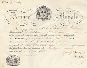 Feuille de vélin de 28,5 x 35 cm. partie gravée aux armes de France en tête et à celle de la duchesse de Berry en pied, partie manuscrite. Texte : " Armée Royale / Sur la proposition de Mr le colonel de LA ROCHEMACE / Commandant la division d’Ancenis / et en vertu des pouvoirs dont j’ai été revêtue comme Régente / de France, j’ai confirmé le trois juillet 1832 / la nomination de Mr CORMERAIS (Louis) / au grade de Sous-Lieutenant dont il a rempli / les fonctions dans la province de Bretagne / au mois de mai et de juin 1832 / Grätz, le 28 février 1837". Signé « de la Rochemacé » en bas à gauche et « Marie Caroline » en bas à droite.