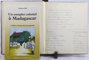 Cahier in-8° carré toilé (17 x 22 cm.) avec 72 pp. manuscrites. Sur la couverture « Tamatave 1896-97 - Notes » et signature ‘H Bertier’, sur la page de garde l’inscription en malgache : « Boky ny Haba. Thèse » (ce qui peut se traduire par ‘Livre de notre Brevet’), suit sur 35 pages un projet d’organisation de la colonie destiné au général Gallieni - signé et daté « Tamatave, 24 Décembre 1896 ». La seconde partie de ce cahier est la copie, manuscrite sur 38 pages, de l’article du professeur de Droit, Em. Cohendy, sur la nationalité des français à l’étranger. En 1896, Henri Bertier est l’interprète attaché au Général Gallieni qui mène une opération militaire de pacification. Dans ce cahier Henri Bertier qui parle différents dialectes malgaches et connaît l’histoire mouvementée des populations soumet à son supérieur des propositions de découpages en provinces suivant les ethnies et propose des mesures concernant l’administration, les écoles, l’impôt… Très intéressant document. Henri Bertier qui restera près de 40 ans à Madagascar finira sa carrière comme Gouverneur Général de cette colonie. *On joint l’ouvrage de Stephen ELLIS « Un complot colonial à Madagascar - 1896 » où il cite Henri Bertier (Karthala 1990, in-8°).