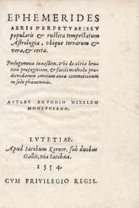 MIZAULD Antoine - Ephemerides aeris perpetuae : seu popularis & rustica tempestatum Astrologia, ubique terrarum & vera & certa… & facili methodo praedicendarum omnium aurae commotionum ex solis phaenomenis. Auctore Antonio Mizaldo...