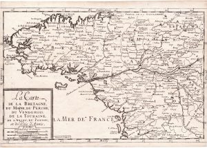 ROUSSEL Claude - "La Carte de la Bretagne, du Maine, du Perche, du Vendômois, de la Touraine, de l’Anjou, du Poitou et du Pais d’Aunis". S.l.n.d. (ca 1691) avec la mention «  Roussel sculpsit ",