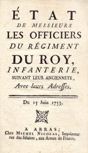 Militaria - ÉTAT DE MESSIEURS LES OFFICIERS DU RÉGIMENT DU ROY, INFANTERIE, suivant leur ancienneté, avec leurs adresses. Du 15 Juin 1753.Arras, Michel Nicolas s.d.,