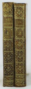 2 vol. in-12 de 244 et 244 pp., en reliure du temps plein veau, dos lisse orné, usures et coins émoussés. Édition originale, partagée entre Paris et Vevey, du premier ouvrage illustré de Restif, ornée de 15 figures hors texte d’André Dutertre gravées en taille-douce. Complet des 6 ff. finaux de la « Revue des ouvrages de l’auteur ». ». « Roman singulier, très rare. Rétif le citait déjà comme épuisé dans les catalogues de ses ouvrages en 1788 » (J. -C. Courbin). De l’aveu même de l’auteur, in Monsieur Nicolas, X-203, cité par Rives Childs : « En cessant de voir Élise, je pensai que Virginie était ma dernière aventure. Je composai le Quadragénaire qui n’est autre chose que l’histoire de ma liaison avec elle. J’y joignis celle des jeunes filles de modes de la Dame Monclar, au coin de la rue Grenelle-Honoré… ».