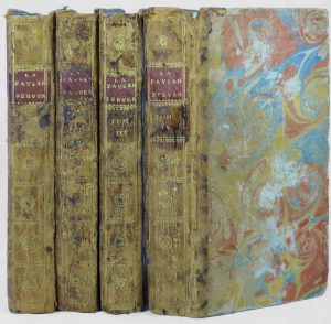 8 parties en 4 vol. in-12 en demi-reliure du temps contenant les titres primitifs sur lesquels sont collés les nouveaux titres qu’exigea la censure ; le titre « la Paysanne pervertie » ayant été interdit par la censure. Édition ornée de 38 figures dessinées par Binet. Table des figures en fin du 4e vol. suivi d’une Table des noms et de « Revue des Ouvrages de l’Auteur » paginé : [blanc - clxx à ccxliv - 6 ff.]. Reliure défraîchie ; collationné complet des gravures et des feuillets complémentaires.