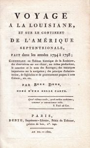in-8° de viii-382 pp. & une carte dépliante dressée par Collin. Reliure postérieure bradel basane havane, un coin émoussé. Ouvrage contenant les vocabulaires de la langue des Naoudoouesois (Dakottah) et des Chippeways. L’auteur, colonel-inspecteur des dragons à Saint-Domingue puis conseiller au Port-au-Prince en 1789, entreprit ce voyage pour vivifier la colonie de la Louisiane. Réf. : Boucher de la Richarderie VI-136 & sq., Clark II-76, Dionne II-915, Sabin 3979, Streeter III-571.