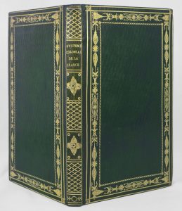 in-8° de xiv-207 pp. Édition originale. Exemplaire relié plein cuir de Russie vert, dos lisse orné de grilles or, plats décorés d’encadrements dorés, toutes tranches dorées, gardes de papier glacé rose. Très bel exemplaire. Contient le plan d’établissement d’une colonie française à Madagascar pour verrouiller l’accès aux Indes et contrer la puissance maritime anglaise. Rare. Exemplaire en parfaite condition.
