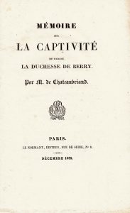 CHATEAUBRIAND (François René, Vicomte de) - Mémoire sur la captivité de Madame la Duchesse de Berry. P., Le Normant 1833 (décembre 1832),