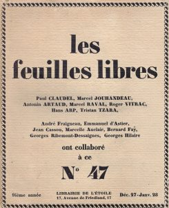 « Les feuilles libres » - [Hans ARP] - Paul CLAUDEL, Marcel JOUHANDEAU, Antonin ARTAUD, Marcel RAVAL, Roger VITRAC, Hans ARP, Tristan TZARA… ont collaboré à ce N° 47. P., Librairie Stock 1927-28 (9ième année - Déc. 27-Janv. 28),
