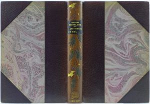 in-8° relié demi-maroquin aubergine à coins, dos lisse passé orné d’un décor floral mosaïqué avec chauve-souris or, tête dorée, couv. conservées (reliure signée ‘Blanchetière’). Ex-dono de l’éditeur.