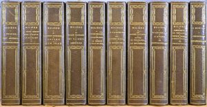 la totalité des 29 pièces éditées reliées en 10 (9 + 1) volumes in-12 demi-maroquin à coins, dos lisse orné d’encadrements géométriques de filets or, tête dorée, toutes couvertures conservées. Édition illustrée de dessins de Leloir gravés à l’eau-forte par Champollion. Cette collection est bien complète, ce qui est peu fréquent, de la « Chronologie Moliéresque », établie par Georges Monval (idem, 1897), reliée à l’identique. Tous exemplaires sur Vergé. Belle série.