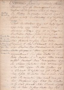 Le texte, entièrement retapé à la machine par le propriétaire du manuscrit, est enrichi de notes explicatives. « … je m’embarquais sur le vaisseau le Neptune pour le voyage de Moka en Arabie pour lequel je suis parti de Pondichéry le 9 février 1743. Point de malheur qui soit aussi complet que celui qui m’est arrivé. Nous arrivâmes à Mahé qui est un comptoir de notre Nation situé sur la côte de Malabar … Le 12 (mars) au soir, nous vîmes au soleil couchant deux embarcations que l’on nomme galvette (cela est beaucoup plus petit qu’une galère) qui se parlaient… Nous vîmes bien que c’étaient des pirates … Nous prîmes les armes pour nous défendre, mais elles ne voulaient que nous reconnaître pour aller avertir leur escadre composée en tout de trois palles et de trois galvettes … Nous fûmes nous coucher tout habillé. A trois heure du matin, l’on vit les six embarcations … (récit de l’attaque et réddition) … Ensuite ils firent un massacre des plus odieux, vous allez le voir par ce qui suit. Premièrement je fus blessé d’un coup de fusil à deux balles en rendant mon arme. Deux Cipayes, c’est deux de leurs soldats, me relevèrent … furent assez exécrables pour me donner deux coups de sabre sur le ventre… il en vint un qui défaisait mes boucles avec son sabre … Nous avions un père Récollet, missionnaire passager pour Moka qui eut le crâne enlevé au dessus de la tête… notre boulanger eut le bras et une cuisse coupés ; heureusement pour lui qu’il tomba évanoui, qu’ils le crûrent mort, ils l’abandonnèrent… ( suivent les circonstances et descriptions des coups et blessures reçus par le capitaine du vaisseau, le second capitaine, les troisième, quatrième et cinquième du vaisseau, ainsi que le sort du premier subrécargue qui était conseiller au Conseil Supérieur de Pondichéry... ). Nous fûmes pris le 13 et nous y restâmes jusqu’au 22… Ils déchargèrent en partie notre vaisseau… pillèrent tous nos effets… Mais le 22 au matin ils ne se méfièrent pas de trois vaisseaux portugais qui étaient en rade de Mangalore et qui appareillèrent sur nous. Ils crurent que c’était un de leurs vaisseaux qui revenait de Chine, car la confiance des bouselots était bien fondée puisqu’ils étaient en traité de paix avec les Portugais… (suit la description de la déroute des pirates, mais…) Les Portugais, qui nous firent une action si généreuse, n’en agirent pas de même par la suite, car non seulement ils nous traitaient en prisonniers, mais ils agirent avec nous comme des pirates… ». Philosophe, ce malheureux ne garde pas rancune aux Portugais et conclut le récit prenant de ses mésaventures et de celles de ses compagnons par ces mots : « Je ne peux vous en dire davantage, ce serait trop long. Ce que je peux vous dire c’est que je leur ai obligation de la vie. »