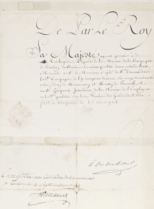 Feuillet manuscrit in-folio (24,5 x 37 cm.) signé « Louis » avec sceau à froid et contresigné « le Duc de Choiseul », le 25 août 1764. Henri de PASCHAL, marquis de ROCHEGUDE (1741-1834), participa à la seconde expédition aux îles Kerguelen en 1773. Une presqu’île et un lac portent son nom près de Port Christmas où il débarqua le 6 janvier 1774 pour y laisser un message de prise de possession de l’archipel, au nom du Roi de France.