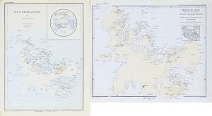 Gravure de 27,5 x 33 cm. imprimée en deux tons. On joint : Iles Kerguelen - carte dressée par Henri Mager pour l’Atlas Colonial (1890). Gravure de 31,5 x 25 cm. imprimée en deux tons.