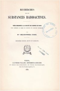 CURIE (Mme SKLODOWSKA) - Recherches sur les substances radioactives. Thèse présentée à la faculté des sciences de Paris pour obtenir le grade de docteur ès sciences physiques. P., Gauthier-Villars 1904,