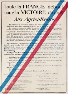 affiche de 40,5 x 57 cm., texte barré des couleurs de la France. Bon ex. « Aux Agriculteurs... » : Texte rédigé par la Fédération des Associations agricoles.