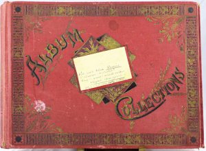 Volume in-folio oblong en reliure éditeur titrée sur le plat « Album - Collections » contenant plus de 250 images soigneusement rangées, dont la plupart sont des chromo. découpées représentant des personnages, des scènes et des motifs floraux… Une carte collée sur le plat indique : « Fait par le Soldat Pasquier, / 8e Chasseur (cultivateur), / Croix de Guerre, médaille militaire / amputé du bras gauche / blessé le 4-11-1916, Sailly-Saillisel ».