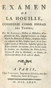 Agriculture.- RAULIN [(Joseph)]. Examen de la houille, considérée comme engrais des terres. Paris, Vincent, 1775,