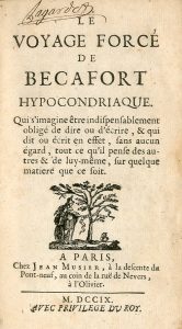 [BORDELON, abbé]. Le voyage forcé de Becafort hypocondriaque. Qui s'imagine être indispensablement obligé de dire ou d'écrire, et qui dit ou écrit en effet, sans aucun égard, tout ce qu'il pense des autres et de luy-même, sur quelque matière...