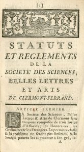 in-12, 3-1 blanche p. Avec : Statuts et règlements de la Société des Sciences, Belles Lettres et Arts de Clermont-Ferrand. En fin : Clermont-Ferrand, Imprimerie Pierre Viallanes, 1773, in-12, 40 p. Ensemble une plaquette brochée, couv. papier 19e (le 1er texte est débroché). La Société littéraire de Clermont naît en 1747. En 1750, elle est reconnue par le roi. Elle se compose alors de trente membres ordinaires, plus cinq membres honoraires et cinq étrangers. En 1780, des lettres patentes l'érigent en académie. Elle est supprimée en 1793 par la Convention, comme toutes les autres académies.