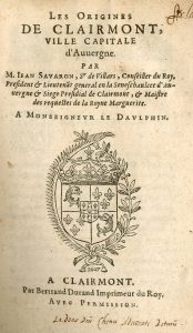 Premier ouvrage d'ensemble sur Clermont-Ferrand.- Clermont-Ferrand.- SAVARON (Jean). Les Origines de Clairmont, ville capitale d'Auvergne. Clairmont, Bertrand Durand, 1607,