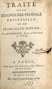 FURGOLE [(Jean-Baptiste)]. Traité de la seigneurie féodale et du franc-alleu naturel. Paris, Jean-Th. Herissant, 1767,