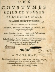 Exemplaire annoté.- Hainaut.- Tournai.- Les Coustumes, stils et usages de l'eschevinage de la ville et cité de Tournay, pouvoir et banlieu d'icelle. Revisitées, approuvées, authorisées, et decretées, par l'Empereur en son Conseil. Avec diverses...
