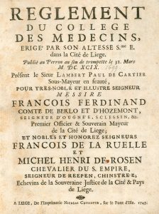 Liège.- Reglement du College des Medecins, par son Altesse Sérénissime dans la Cité de Liége. Publié au Perron au son de trompette le 31 mars M.DC.XCIX [1699] [...]. Liege, De l'Imprimerie Nicolas Counotte, 1743,