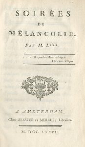 [LOAISEL DE TRÉOGATE (Joseph-Marie)]. Soirées de mélancolie. Par M. L***. Amsterdam, Arkstrée et Merkus, 1777, 8°, [4]-XIV-[2]-160 p. Suivi de : IDEM. La Comtesse d'Alibre, ou Le Cri du sentiment. Anecdote françoise. La Haye, et se trouve à...