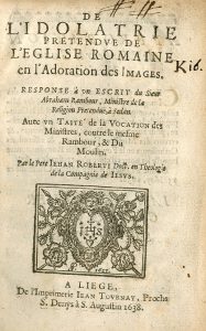 ROBERTI (Iehan). De l'idolatrie pretendue de l'Eglise Romaine en l'adoration des images. Response à un escrit du sieur Abraham Rambour, Ministre de la Religion Pretenduë à Sedan. Avec un Traité de la Vocation des Ministres, contre le mesme...