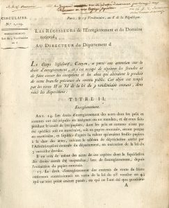 (LACOSTE Pierre-Louis) (°1735), fonctionnaire des domaines, un des premiers administrateurs de la Régie de l'Enregistrement et des Domaines (1791).- CHARDON-VANIÉVILLE (Jean-Baptiste) (ca 1745 - après 1813), fonctionnaire des domaines, un des premiers administrateurs de la Régie de l'Enregistrement et des Domaines (1791). Circulaire imprimée de la Régie de l'Enregistrement et des Domaines, Paris, 19 vendémiaire an 6 (10 oct. 1797), 31 p 4°, en-tête des régisseurs. Circulaire n° 1109 adressée à Pierre-Éléonore POUJAUD de NANCLAS, ancien fermier général, directeur de la Régie en Charente, député de la Charente et intitulée « Enregistrement. Loi du 9 vendémaire an 6 ». Elle est signée des trois régisseurs : Barrairon, Lacoste et Chardon-C105