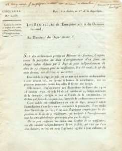 BOCHET (Edme) (1742-1837), fonctionnaire des domaines, un des premiers administrateurs de la Régie de l'Enregistrement et des Domaines (1791), officier de la Légion d'Honneur, père d'Edme Bochet et Mme Panckoucke, peints par Ingres. Ingres fit aussi un portrait de lui à la mine de plomb (Metropolitan Museum of Art, N.Y.).- GINOUX (Raymond-Gabriel) (1769-1850), fonctionnaire des domaines, administrateur en l'an 6, maire de Sucy-en-Brie après 1838. Circulaire imprimée de la Régie de l'Enregistrement et des Domaines, Paris, 7 nivôse an 6 (27 déc. 1797), 2 p. 4°, en-tête des régisseurs. Circulaire n° 1168 adressée à Pierre-Éléonore POUJAUD de NANCLAS, ancien fermier général, directeur de la Régie en Charente, député de la Charente et intitulée « Cédule de citation et exploit à la suite, sujets, l'une et l'autre à l'enregistrement ». Elle est signée des trois régisseurs : Hourier-Éloy, Bochet et Ginoux.