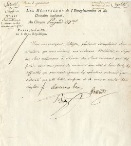 BOCHET (Edme) (1742-1837), fonctionnaire des domaines, un des premiers administrateurs de la Régie de l'Enregistrement et des Domaines (1791), officier de la Légion d'Honneur, père d'Edme Bochet et Mme Panckoucke, peints par Ingres. Ingres fit aussi un portrait de lui à la mine de plomb (Metropolitan Museum of Art, N.Y.).- POISSANT (Jean-Baptiste) (1747 - après 1813), quitta le séminaire pour rentrer aux domaines, un des premiers administrateurs de la Régie de l'Enregistrement et des Domaines (1791). Circulaire manuscrite de la Régie de l'Enregistrement et des Domaines, Paris, 6 ventôse an 6 (24 févr. 1798), 1 p. 4°, en-tête des régisseurs. Circulaire n°1223 adressée à Pierre-Éléonore POUJAUD de NANCLAS, ancien fermier général, directeur de la Régie en Charente, député de la Charente et intitulée « Bois nationaux à séparer des bois riverains par des fossés. ». Elle est signée des trois régisseurs : Hourier-Éloy, Bochet et Poissant.