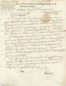 BOCHET (Edme) (1742-1837), fonctionnaire des domaines, un des premiers administrateurs de la Régie de l'Enregistrement et des Domaines (1791), officier de la Légion d'Honneur, père d'Edme Bochet et Mme Panckoucke, peints par Ingres. Ingres fit aussi un portrait de lui à la mine de plomb (Metropolitan Museum of Art, N.Y.).- POISSANT Jean-Baptiste (1747 - après 1813), quitta le séminaire pour rentrer aux domaines, un des premiers administrateurs de la Régie de l'Enregistrement et des Domaines (1791). Circulaire manuscrite de la Régie de l'Enregistrement et des Domaines, Paris, 29 nivôse an 6 (18 janv. 1798), 1 p. 4°, en-tête des régisseurs. Circulaire n° 1190 adressée à Pierre-Éléonore POUJAUD de NANCLAS, ancien fermier général, directeur de la Régie en Charente, député de la Charente et intitulée « Débitans de poudre à tirer dispensés du droit de patente ». Elle est signée des trois régisseurs : Hourier-Éloy, Bochet et Poissant.