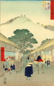 53 vues de la route du tokaido - station 21 : mariko. Série Gojusan Tsugi Meisho Zue (Tokaido vertical). Tirage : 1880. Perspective occidentale (Uki-e). Dimensions (33 x 21,8 cm apparents). Encadré, frange intérieure dorée et cadre bois noir.