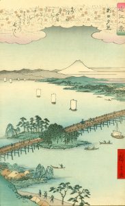 Omi hakkei (Eight views of Omi) ou 8 vues du lac Biwa. Numéro 7 - Coucher de soleil à Seta. Imprimé vers 1880. Dimensions (33,4 x 21,4 cm apparents). Encadré, frange intérieure dorée et cadre bois noir.