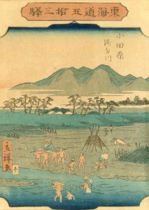 Série Tokaido Gojusan kuwa (1865). Station numéro 10 - Odawara. Dimensions (22,8 x 16,2). Encadré bois peint en rouge, passe-partout.