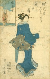 . Encadré en haut à gauche : Shujusho à la recherche de sa mère. Image principale : beauté debout tenant un parapluie. Dimensions (34,4 x 22,3 cm apparents). Encadré, frange intérieure dorée et cadre bois noir.