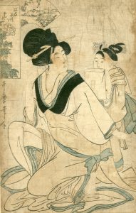UTAMARO (1753-1806). Jeune beauté recevant un article votif dans une pochette tenue par une maïko (apprentie geisha).