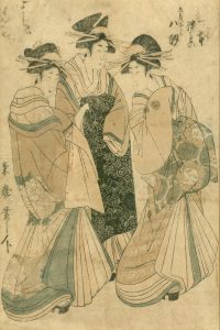 UTAMARO (1753-1806). Publicité pour une maison de thé représentée par trois courtisanes célèbres.