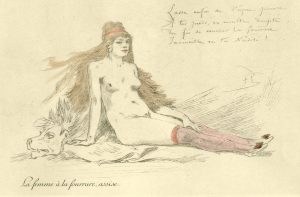 ROPS (Félicien). "La Femme à la fourrure, assise". Héliogravure rehaussée de couleurs ....