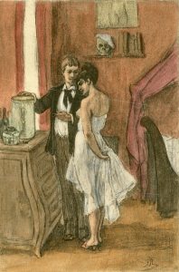 ROPS (Félicien)."La Médecine". Héliogravure rehaussée de couleurs à l'aquarelle, montée sous passe-partout et cadre en bois.