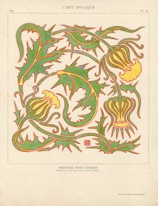 Lithographie en noir telle que publiée dans "Art et Charité" éditée au profit "des pauvres honteux". Dim. support : 40 x 30 cm ; sujet : 30 x 20 cm./ IDEM. "Broderie pour coussin" (1897). Lithographie originale en 3 couleurs. Planche 15 de L'Art appliqué (1897). Dim. support : 37,5 x 27,5 cm ; sujet : 24,5 x 23 cm./ ANONYME. Sans titre [Elégante]. Encre de Chine sur papier. Dessin dans le style de Gisbert Combaz. Dim. support : 33 x 26,5 cm ; sujet : 28 x 13 cm./ Ens. 3 pièces.