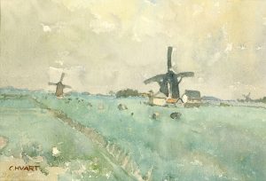 "Delft". Aquarelle sur papier, titrée, signée au coin infér.gauche et montée sous passe-partout vert et cadre en bois. Dim. cadre : 32 x 42 cm ; sujet : 18,5 x 26,5 cm.