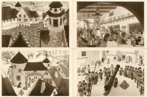DRATZ.-Suite de 10 cartes postales offrant des scènes de la vie joyeuse d'une ancienne Belgique imaginaire publiée par l'éditeur Wellens et Godenne à Bruxelles à l'occasion de l'exposition "A Century of Progress Chicago Worlds' Fair" en 1933.