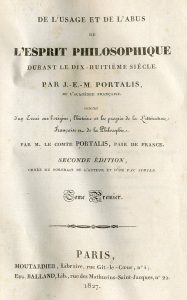PORTALIS (J.-É.-M.). De l'usage et de l'abus de l'esprit philosophique durant le dix-huitième siècle. Précédé d'un Essai sur l'origine, l'histoire et les progrès de la littérature française et de la philosophie. Par M. le comte Portalis....